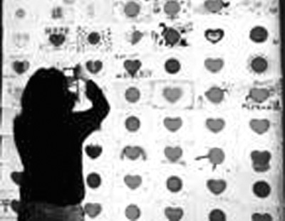 圖為展覽現(xiàn)場特別展出了香港藝術(shù)家文晶瑩策劃的“一人一心”藝術(shù)創(chuàng)作。800多幅來自臺(tái)灣、香港、日本、韓國和英國民眾的作品,以不同語言寫著“日本政府請道歉”、“用愛撫平傷痛”等,希望能用和平的方式發(fā)聲。