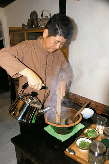 擂好的茶緩緩注入滾水,香氣竄鼻。圖自臺(tái)灣《聯(lián)合報(bào)》