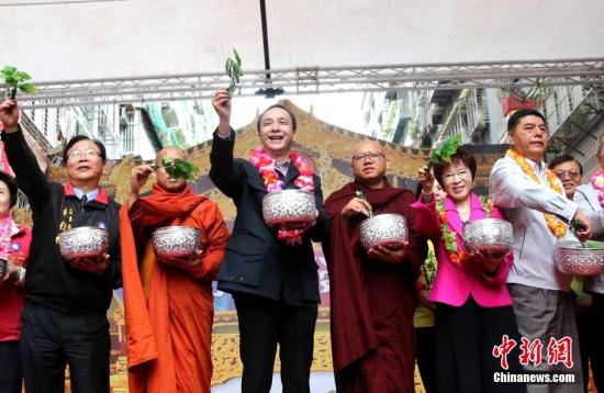 4月12日,新北市長朱立倫(左三)、臺“立法院”副院長洪秀柱(右二)出席新北市潑水節(jié),參與“灑凈去厄”活動。中新社發(fā) 陳小愿 攝
