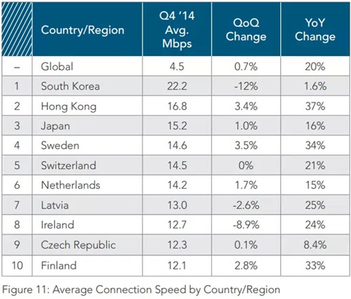 網(wǎng)速全球第二。根據(jù)全球CDN服務(wù)提供商Akamai發(fā)布的《2014年第四季互聯(lián)網(wǎng)發(fā)展?fàn)顩r報(bào)告》顯示,香港網(wǎng)速僅次于韓國(guó)位居全球第二,平均網(wǎng)速為16.8Mbps,是世界平均值4.5Mbps的大約3.5倍。