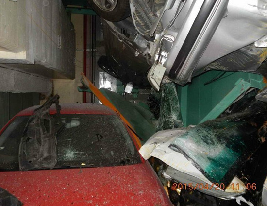 臺(tái)北市松江路128號(hào)停車塔因?yàn)榈卣鹩绊,汽車掉落,多輛汽車堆棧。臺(tái)灣聯(lián)合新聞網(wǎng)圖