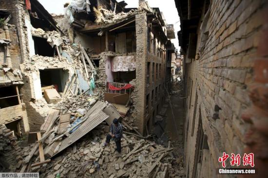 4月25日,尼泊爾發(fā)生里氏8.1級(jí)地震,首都加德滿都大量房屋倒塌,部分道路堵塞中斷。圖為尼泊爾民眾在廢墟中尋找親人。