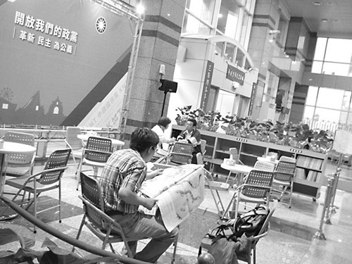 走進黨部大門,記者發(fā)現(xiàn),原來一樓舉行活動、召開記者會的地方已完全變了模樣,成了現(xiàn)在的“聯(lián)誼廳”,周一至周五上午9時至下午5時對外開放。聯(lián)誼廳里擺了6張圓桌,各配了4把椅子。還備有茶水、咖啡、點心,陳列了書報資料,民眾可以自由使用。聯(lián)誼廳里有人在聊天,有人在看報。