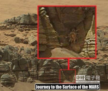 網(wǎng)友們?cè)诨鹦菐r石上發(fā)現(xiàn)巖壁上有一處色澤較淺的物體,把照片放大一看發(fā)現(xiàn)具有好幾個(gè)腳,形體和螃蟹十分相像,但也有人認(rèn)為他是蜘蛛,再次掀起大家對(duì)火星人有生物的討論,而這也不是好奇號(hào)首次拍下可疑圖像,早先它拍攝到一塊疑似骸骨的物體,以及類似金字塔的巖石。