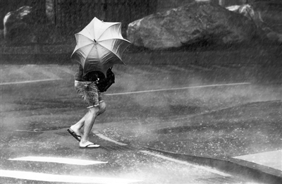一名撐傘的路人在臺北市區(qū)冒著風雨行進。新華社記者 韓瑜慶攝