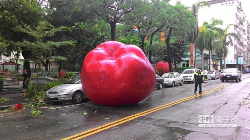 另據(jù)臺(tái)灣中時(shí)電子報(bào)報(bào)道,位在臺(tái)中市大墩十一街一間幼兒園,用來裝飾園區(qū)的大型紅蘋果,在蘇迪勒強(qiáng)風(fēng)吹襲下,整顆蘋果從園區(qū)大樓掉了下來,掉出路面沿途滾了20幾米,占用了大墩十一路半個(gè)車道,也擦撞停放路邊的五輛轎車才停止。所幸大蘋果是空心體,沒有造成多大的災(zāi)損,民眾看到路中央突然出現(xiàn)一顆大蘋果,覺得很訝異,還有人停下車來拍照,最后在附近民眾的合力幫忙之下才將大蘋果滾進(jìn)園區(qū),讓道路交通恢復(fù)順暢。