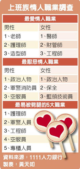 據(jù)臺(tái)灣《中國(guó)時(shí)報(bào)》報(bào)道,今天是七夕情人節(jié),究竟男、女性上班族最?lèi)?ài)及最厭惡的情人職業(yè)是什么呢?根據(jù)臺(tái)灣人力銀行最新調(diào)查,男、女性上班族最?lèi)?ài)的情人職業(yè)與過(guò)去改變不大,倒是最厭惡的情人職業(yè),竟不約而同都是政治人物,原因是政治人物沒(méi)有上下班,更沒(méi)有隱私,不利戀情發(fā)展。