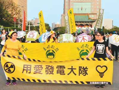 臺(tái)灣反核電人士打出“用愛(ài)發(fā)電”橫幅