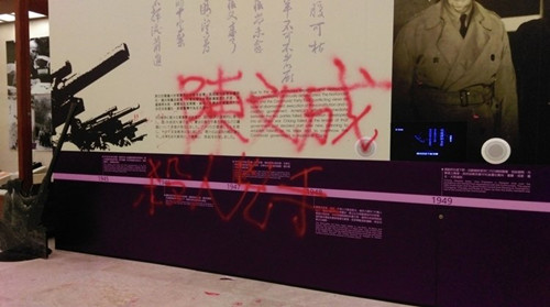 臺北中正紀念堂管理處新聞聯絡人蘇虹綾表示,當時展廳巡邏人員只有一位,10多位噴漆人士混在游客群內,進門后走到墻面分成兩側,拿出噴漆罐使用,過程非常快速,警方也很快到場。