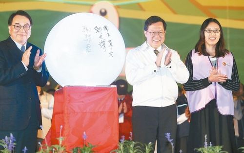 桃園市長鄭文燦(中)在瑜伽球上簽名留念,為燈會(huì)寫下完美句點(diǎn)。來源:臺(tái)灣《聯(lián)合報(bào)》