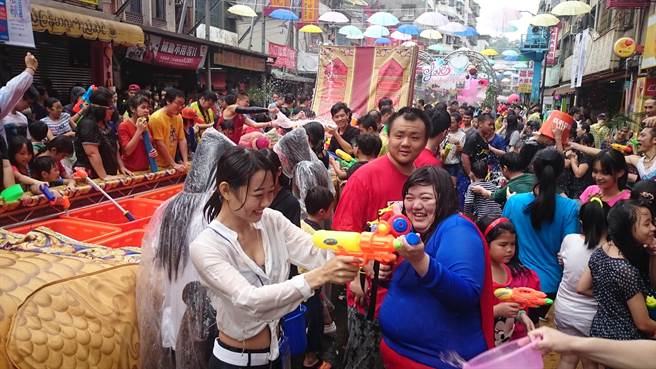 新北市潑水節(jié)今天在新北中和區(qū)華新街登場,民眾拿起水槍大打水仗,玩得不亦樂乎。(圖片來源:臺灣“中時(shí)電子報(bào)”)