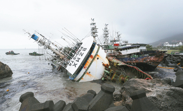 “莫蘭蒂”過后,高雄西子灣北側(cè)防坡堤有四艘大型遠(yuǎn)洋漁船擱淺,傳出有一人不幸罹難。臺(tái)當(dāng)局“漁業(yè)署”與海巡人員上午還在現(xiàn)場搶救。(圖片來源:臺(tái)灣聯(lián)合新聞網(wǎng))