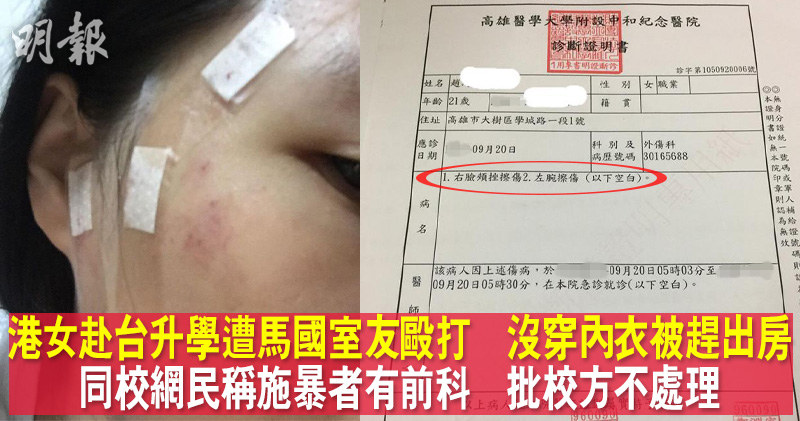 據(jù)香港《明報(bào)》9月22日報(bào)道,一名在臺灣高雄義守大學(xué)就讀的21歲趙姓香港少女,疑因不小心弄翻東西吵醒睡覺中的室友,被對方以水樽、掃把等毆打。少女驗(yàn)傷后證實(shí)側(cè)臉流血,身上多處擦傷及瘀青。有同校網(wǎng)友表示,涉事室友是馬來西亞人,之前也有相關(guān)暴力紀(jì)錄,但校方否認(rèn),趙姓少女的臺灣籍男友擔(dān)心事件會(huì)被校方“壓下去”。