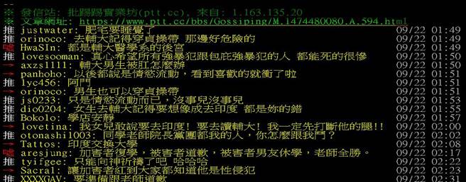 島內(nèi)著名論壇PTT八卦版也出現(xiàn)“輔大心理系跟印度哪里比較可怕?”、“輔大那塊土地是不是印度領(lǐng)地?”、“ 大家還會想讀輔大嗎?”等問卦文。內(nèi)容提到“新莊中正路上有間學(xué)校,在里頭犯下性侵的加害人似乎都不會什么事。被侵犯的被害人及被害人男友被抓出來“被道歉”惹。這個情節(jié)跟印度人的日常有87%像。好奇問一下,輔大那塊土地是不是印度的國土啊?”