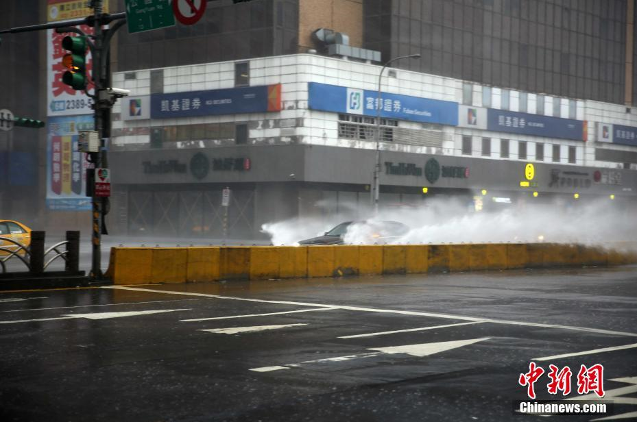 9月27日,“鲇魚”臺風橫掃臺灣,強風暴雨造成樹倒車翻,造成人員死傷。據(jù)臺灣災害應變中心統(tǒng)計,至27日晚上8時,臺風造成4死268傷。圖為臺北車站前大街汽車駛過,濺起一人多高的浪花。中新社記者 黃少華 攝