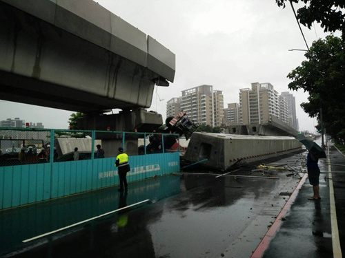 據(jù)臺(tái)灣聯(lián)合新聞網(wǎng)報(bào)道,新北市淡水區(qū)中山北路三段與濱海路一段交叉路口,正在施作的淡水捷運(yùn)輕軌工程,傳出正在吊掛的軌道掉落,現(xiàn)場(chǎng)有一臺(tái)吊車跟軌道一起翻落地面,男性吊車司機(jī)受傷,但目前意識(shí)清醒,警消趕往搶救中。(記者祁容玉)