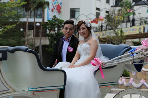 今天新人中的李旨浩與江敏晶,因參加新北市舉辦的未婚聯(lián)誼而結(jié)緣,2人交往過(guò)程中都在準(zhǔn)備考試,長(zhǎng)時(shí)間待在圖書(shū)館感情升溫快,在考試結(jié)束后,便決定結(jié)婚。今天英倫風(fēng)婚禮,現(xiàn)場(chǎng)特別租用3輛白色馬車,讓新人搭馬車進(jìn)場(chǎng)走紅地毯,還有新人穿蘇格蘭裙,在臺(tái)灣婚禮服裝可說(shuō)相當(dāng)少見(jiàn);槎Y還由朱立倫抽出2對(duì)新人,贈(zèng)送英國(guó)倫敦來(lái)回機(jī)票做賀禮。(記者魏翊庭)