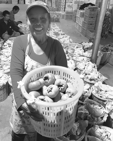 果農(nóng)高興地展示豐收的甜柿。