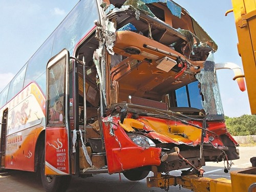 滿載福興宮志工的游覽車不慎追撞前車,車頭全毀。 臺(tái)灣《聯(lián)合報(bào)》記者邵心杰/攝影