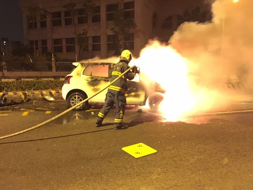 高雄市今天清晨發(fā)生酒駕撞上分隔島火燒車意外,駕駛及時逃出。來源:臺灣《聯(lián)合報(bào)》(高雄市消防局提供)