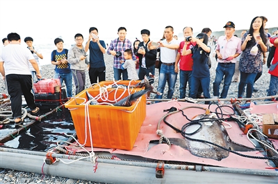 圖為“洄游吧”體驗(yàn)者圍觀花蓮七星潭漁獲。