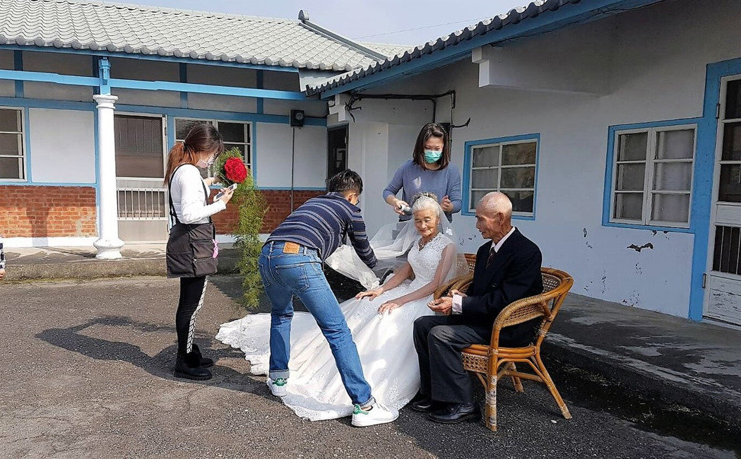 據(jù)臺灣媒體報道,嘉義縣太保市公所為舉辦市長就職2周年及“幸福太保 感恩有你”金婚楷模表揚活動,今天為轄區(qū)14對金婚夫妻定裝、拍攝婚紗照。86歲阿嬤抗拒穿白紗,并表示62年前就結(jié)婚了,現(xiàn)在這么老還拍婚紗照,“你會害我被人笑!”