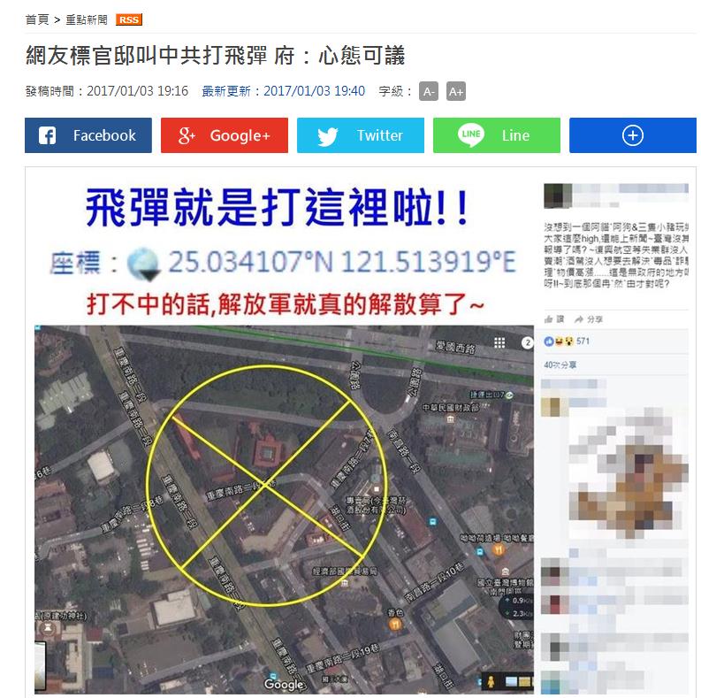 報道稱,有網(wǎng)友在臉書成立社團,甚至直接放上Google地圖,畫面清楚標示總統(tǒng)官邸的座標,且向對岸放話,要中國大陸的導彈往這個座標打,甚至嗆聲“打不中的話,解放軍就真的解散算了”。