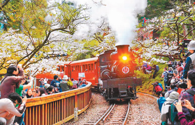 阿里山蒸汽火車穿梭櫻花林的美景,是游客最喜歡捕捉的經(jīng)典畫面。(照片由阿里山風(fēng)景區(qū)管理處提供)