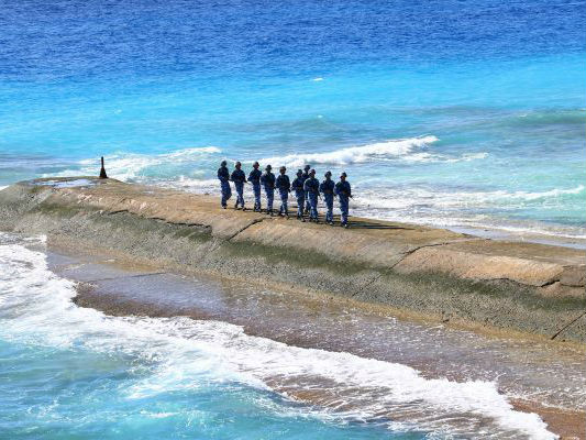 資料圖:守衛(wèi)在南沙群島永暑礁上的海軍官兵在防波堤上巡邏。