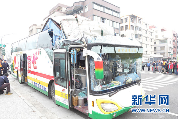 這是2月4日拍攝的發(fā)生事故的游覽車。當(dāng)日,一輛滿載大陸游客的游覽車在臺(tái)灣高雄市失控撞到路邊橋墩,造成車上多人受傷送醫(yī)。 新華社發(fā)