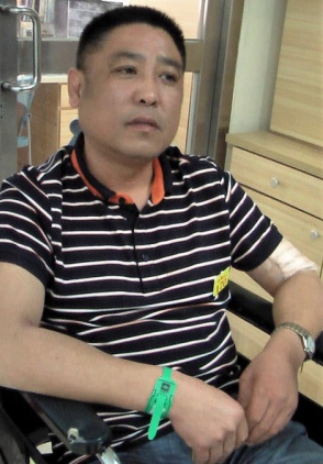 章國海事故發(fā)生后被送至高雄市立大同醫(yī)院急救,坐在輪椅裹傷邊打點(diǎn)滴邊受訪。