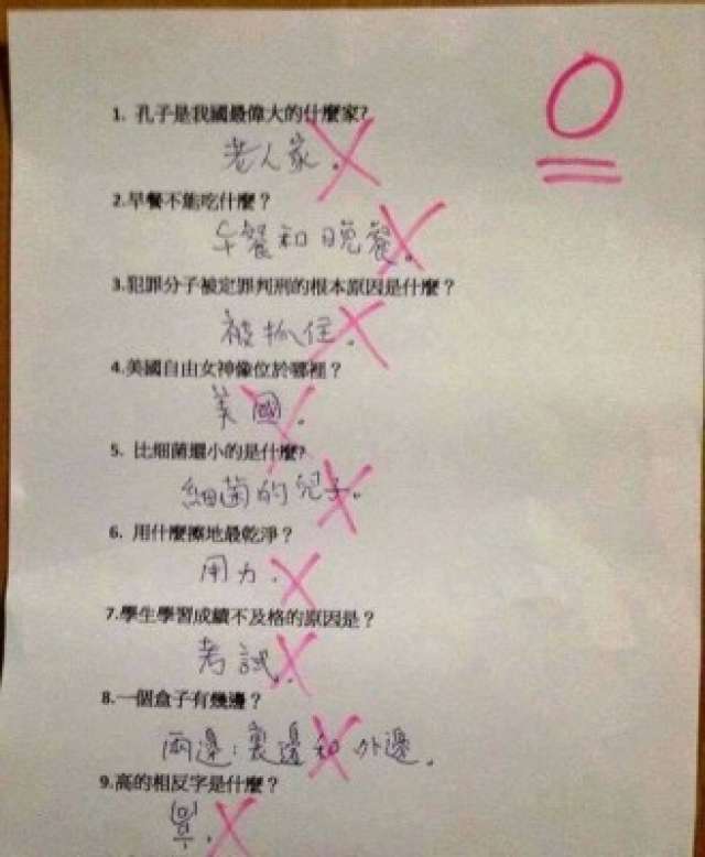 10道天馬行空的答案,雖然全部被打上了紅色的“×”,得了零分,但卻讓不少網(wǎng)友直呼“看不出錯(cuò)在哪?”、“其實(shí)這樣也沒(méi)錯(cuò),這叫跳出框架思考”,有網(wǎng)友大贊“人才啊”。