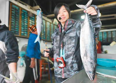 3月8日,黃紋綺在與“洄游吧”合作的定置漁場(chǎng)內(nèi)查看剛捕獲的魚(yú)。