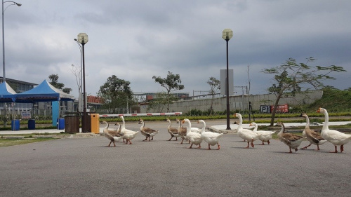 苗栗縣知名景點(diǎn)“客家圓樓”周邊水域放養(yǎng)的華鵝、綠頭鴨等水禽,最近頻頻上岸“逛大街”。臺(tái)灣《聯(lián)合報(bào)》記者胡蓬生/攝影
