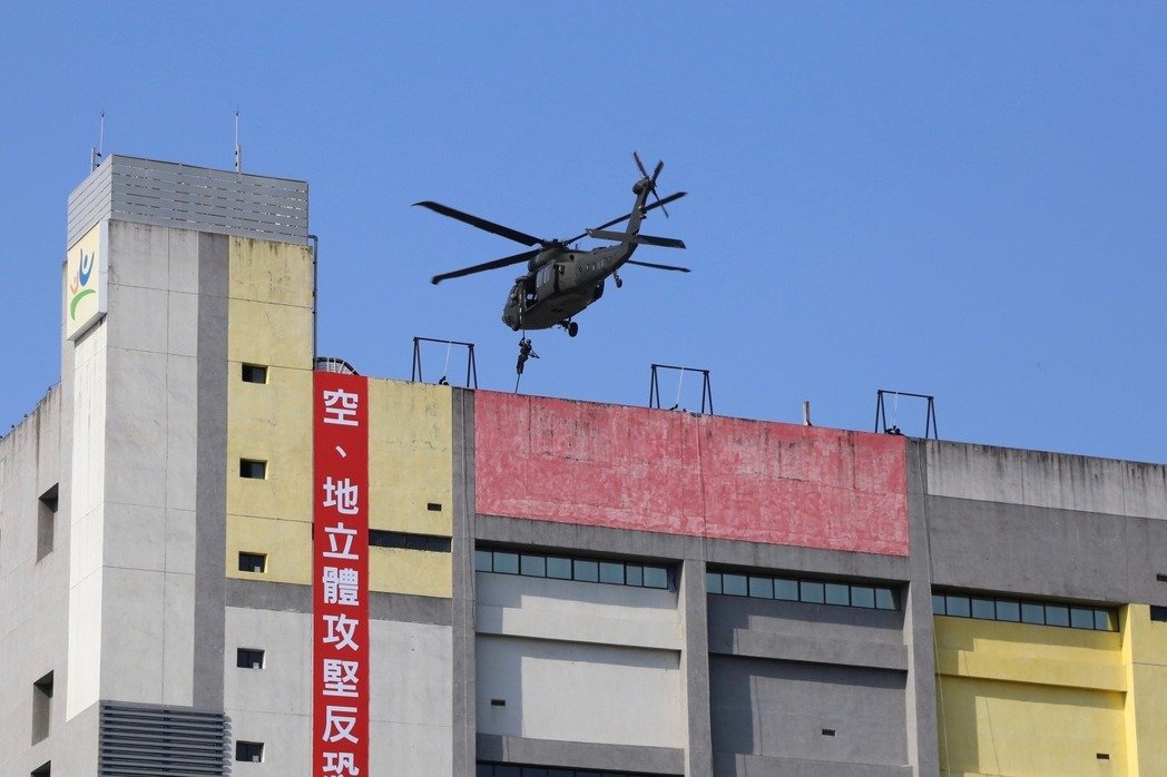 此外,針對恐怖攻擊,則模擬賽事期間發(fā)生恐攻并癱瘓周邊交通,多名恐怖份子逃竄于體育園區(qū)內(nèi),臺(tái)“警政署”依反恐機(jī)制向臺(tái)軍請求支持,由“憲兵”指揮部特種勤務(wù)隊(duì)配合黑鷹直升機(jī)實(shí)施空、地立體攻堅(jiān)作業(yè),運(yùn)用繩索迅速垂降后再近戰(zhàn)格斗制伏歹徒。