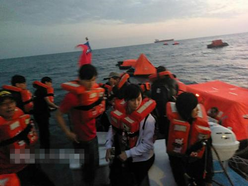 圖為海巡隊(duì)將乘坐救生艇的游客救上巡防艇。圖片來(lái)源:臺(tái)灣“中央社”