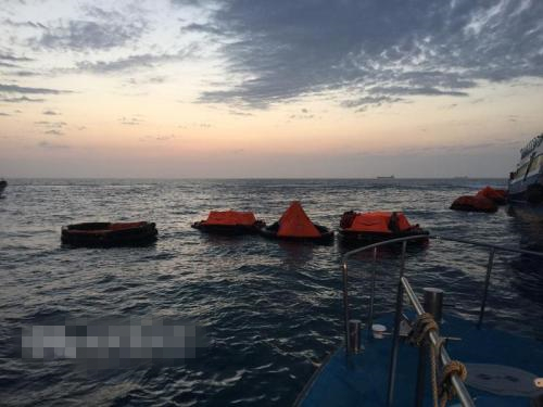 圖為海巡隊(duì)趕往時(shí), “凱旋3號(hào)”已放下救生艇。圖片來(lái)源:臺(tái)灣“中央社”