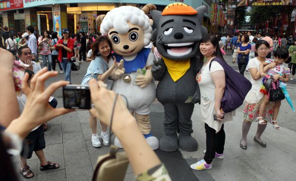 資料圖:2010年6月19日,游客在臺(tái)北西門(mén)町與大陸動(dòng)畫(huà)片主角“喜羊羊”、“灰太狼”的大型人偶一起合影。新華社記者費(fèi)茂華攝