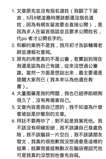 女中學(xué)生又說她的原意不是要全民公審補習(xí)老師,她選擇說出來,是希望提醒大家別受害。另外她強調(diào),當(dāng)初沒指名道姓,但不少人留言指認(rèn),補習(xí)老師的身份才會被揭發(fā)。