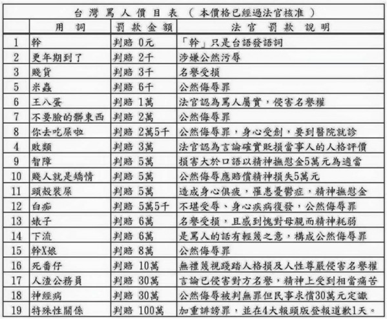 【環(huán)球時(shí)報(bào)-環(huán)球網(wǎng)報(bào)道 記者 畢方圓】在臺(tái)灣,逞一時(shí)口舌之快,可能吃官司。有臺(tái)灣網(wǎng)友依據(jù)法院判例,整理出“臺(tái)灣罵人價(jià)目表”,在網(wǎng)上瘋傳。