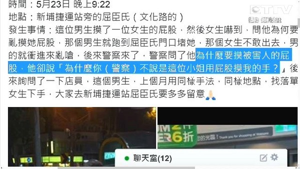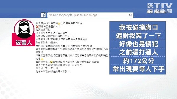 事后有另外一名被害女子在facebook“爆料公社”發(fā)文指控,疑似遭到同一名男子騷擾,說當(dāng)時(shí)被碰撞胸口,“男子還對(duì)我笑了一下,好像也是慣犯,之前打過人,身高約172公分,都在板橋文化路出沒,提醒民眾注意。”