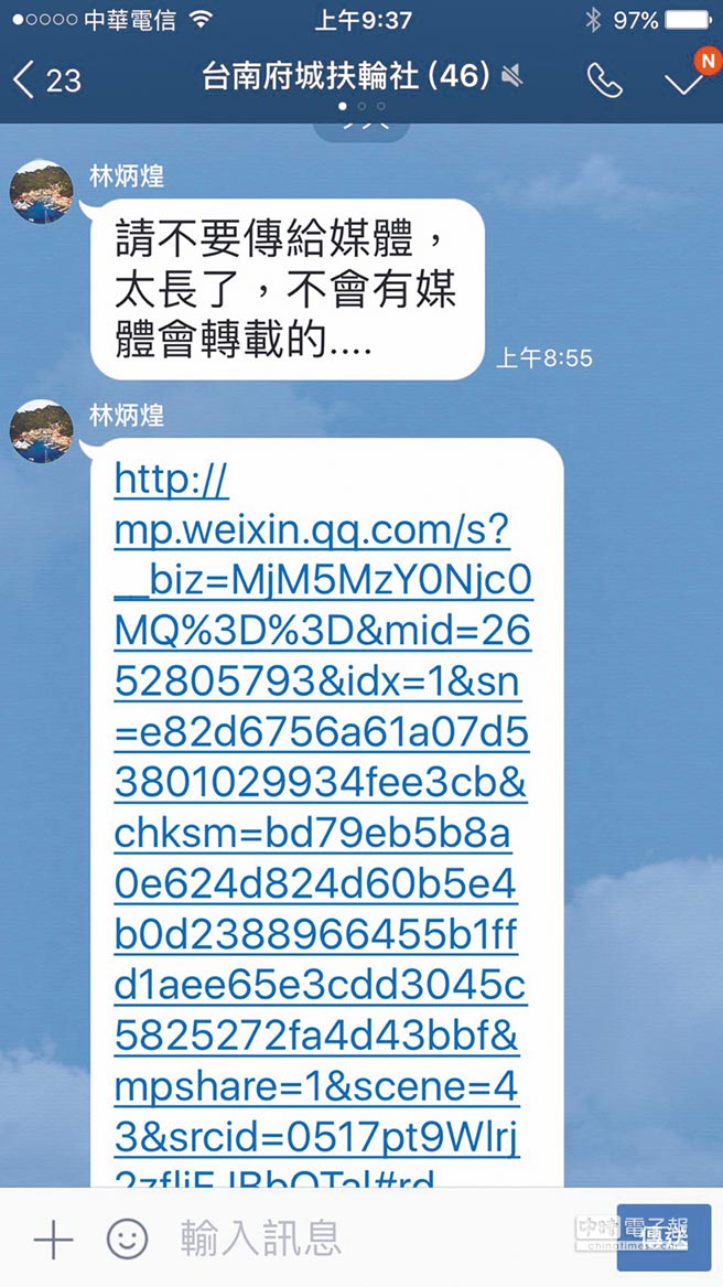 林炳煌在社交媒體發(fā)出一篇他人撰寫的評(píng)論短文。(圖片來(lái)源:臺(tái)灣“中時(shí)電子報(bào)”)