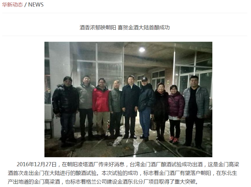 注意,這是一張講述去年12月27日“舊事”的圖片,取自遼寧朝陽一家名為華新建設(shè)集團(tuán)的企業(yè)網(wǎng)站。該消息稿稱,金門高粱酒首次走出金門在大陸進(jìn)行了釀酒試驗(yàn)并取得成功,標(biāo)志著金門高粱酒廠有望落戶朝陽,在東北生產(chǎn)出地道的金門高粱酒。