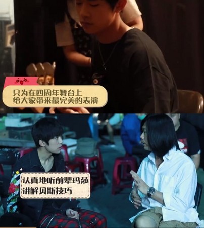 易烊千璽和瑪莎請教貝斯。(圖片來源:“TFBOYS組合”新浪微博發(fā)布影片截圖)