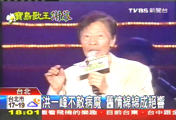 臺(tái)當(dāng)局“新聞局”去年也撥款新臺(tái)幣400萬(wàn)元,補(bǔ)助洪一峰的兒子洪榮宏拍攝洪一峰的紀(jì)錄片。不幸的是,洪一峰去年檢查出胰臟癌末期,隨后感冒并發(fā)肺炎,引發(fā)敗血性休克后緊急送院治療。洪一峰入院后持續(xù)昏迷2個(gè)月,下午因胰臟癌引發(fā)多重器官衰竭辭世;社會(huì)大眾未來(lái)僅能透過(guò)紀(jì)錄片,以及他遺留的經(jīng)典作品,緬懷這位才華洋溢的“寶島歌王”。