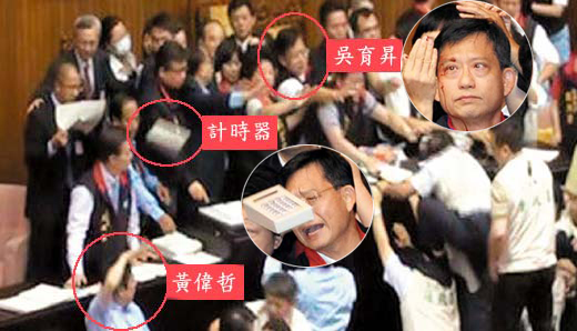 臺灣藍綠“立委”8日因兩岸經濟合作框架協議(ECFA)審議爆發(fā)流血沖突,藍綠“立委”多人掛彩被送醫(yī)治療。民進黨“立委”黃偉哲扯下1.1公斤重的定時器,然后趁著四下無人,朝著臺上一排的國民黨“立委”丟去,正好砸中吳育升頭部。造成吳育升眼角流血,送醫(yī)急救后縫了八針。