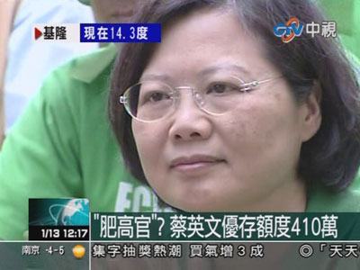 馬英九批評民進黨版18%(臺灣軍公教18%優(yōu)利存款)政策改革造成肥高官、瘦小吏,據(jù)藍營人士透露,民進黨主席蔡英文優(yōu)存額度達410萬元(新臺幣,下同),換算年領(lǐng)優(yōu)惠利息73萬元,在民進黨退休政務官員中,優(yōu)存額度最高,優(yōu)惠利息也最多,屬最肥高官。臺灣世新大學傳播所長游梓翔斷言,如果情況屬實,蔡英文2012年就不必選臺灣地區(qū)領(lǐng)導人了。【詳細】