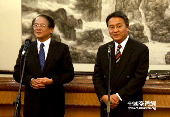 “兩岸經(jīng)濟(jì)合作框架協(xié)議”第三次兩會(huì)專家工作商談13日在北京舉行。圖為商談結(jié)束后,海協(xié)會(huì)理事唐煒與;鶗(huì)顧問黃志鵬回答記者提問。(中國臺(tái)灣網(wǎng) 張弛 攝)