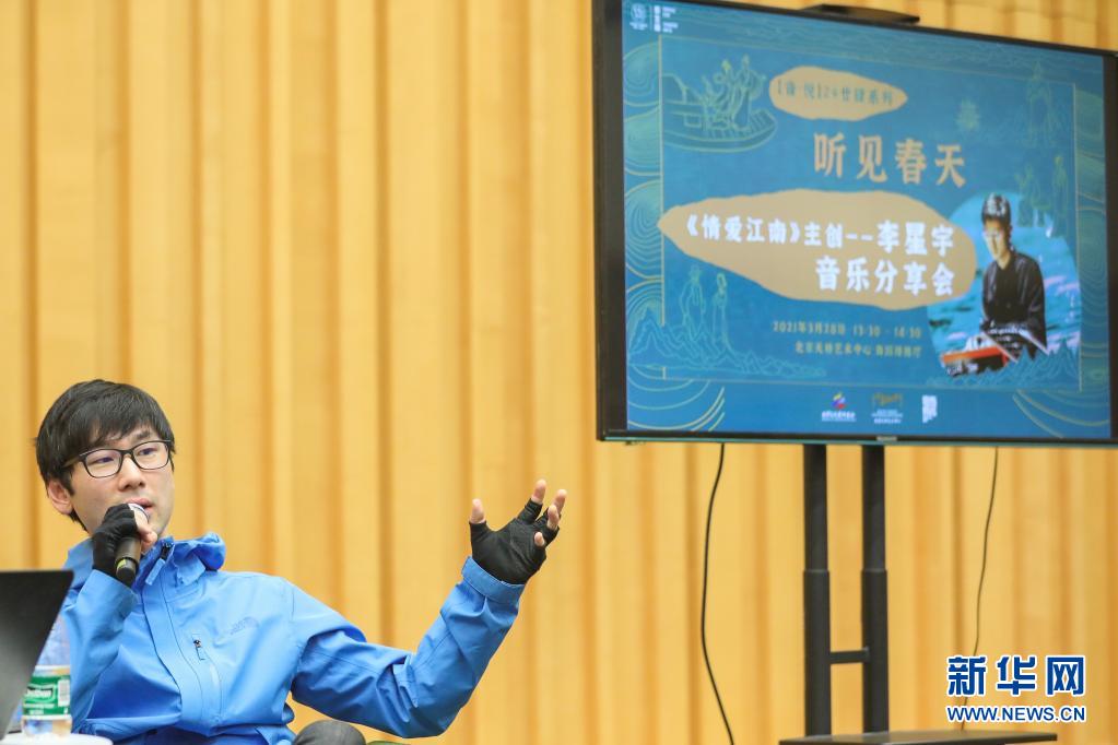當(dāng)日,主題為“廿肆節(jié)氣 聽見春天”的《情愛江南》主創(chuàng)音樂分享會活動在北京天橋藝術(shù)中心舉行,拉開了天橋藝術(shù)中心春季系列活動的序幕。本次音樂分享會活動是北京文化藝術(shù)基金年度資助項目——“周末藝聚”藝術(shù)推廣系列活動的重要活動之一。新華社記者 張玉薇 攝