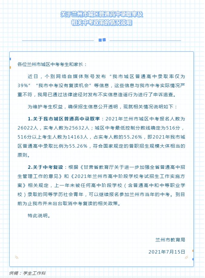 中考無復(fù)讀機(jī)會?蘭州教育局辟謠:未出臺相關(guān)政策